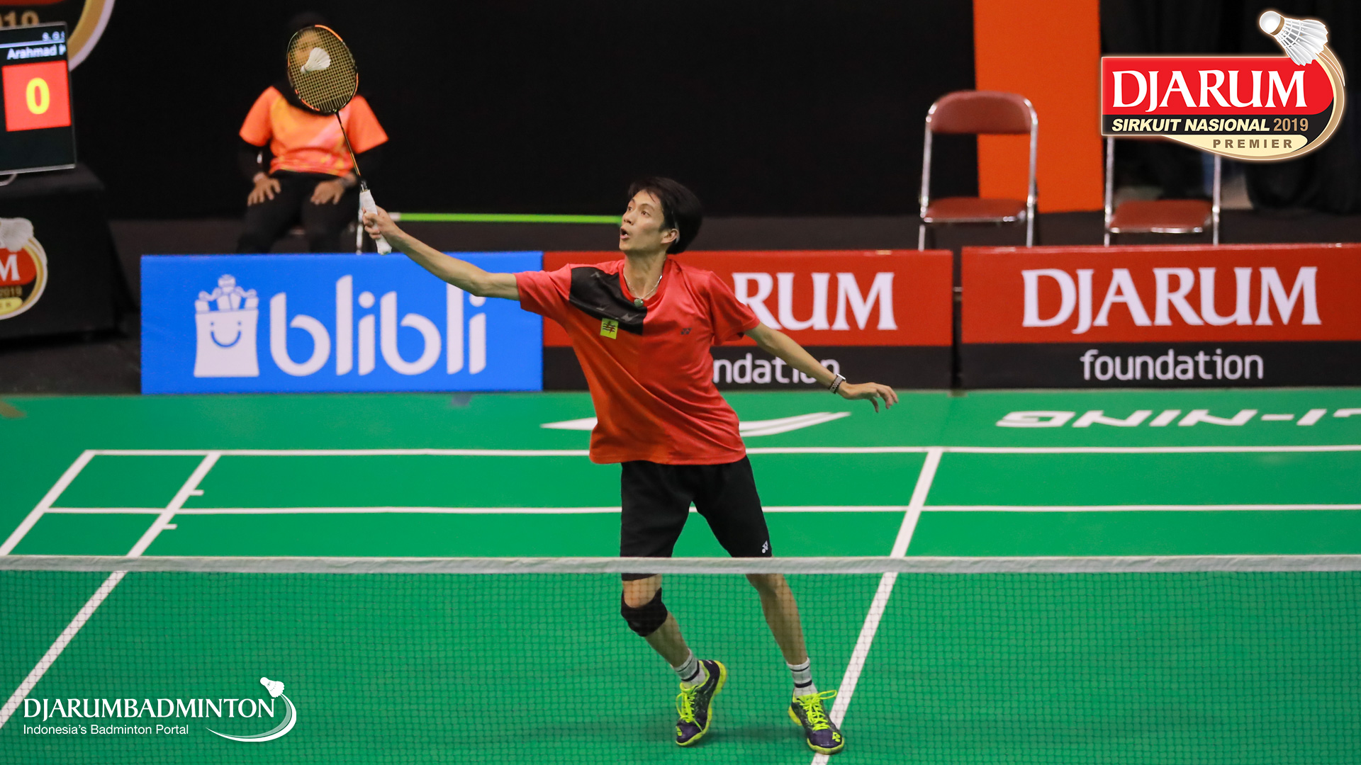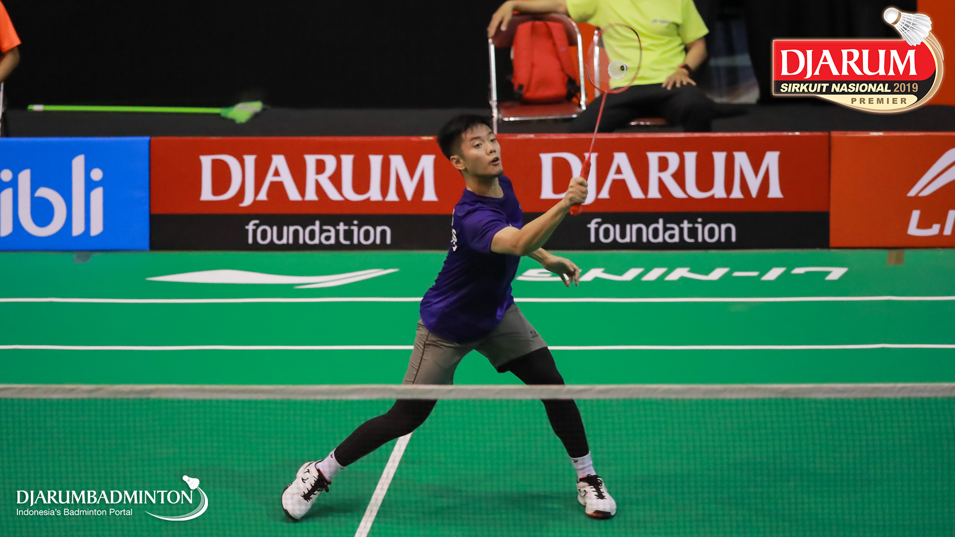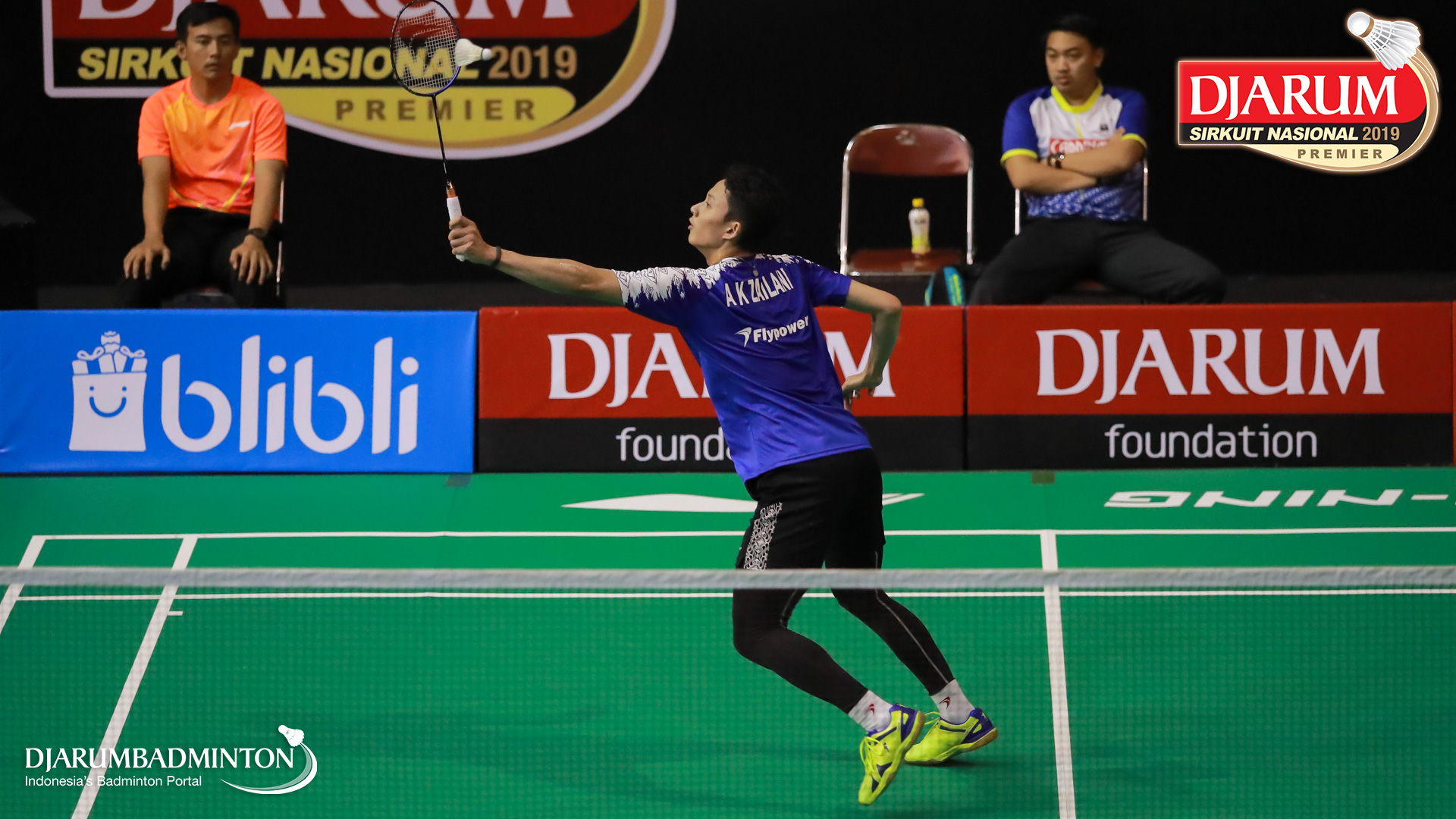 Rezha Akbar Raja Husain Ym (PB Djarum, Kudus) melepaskan serangan