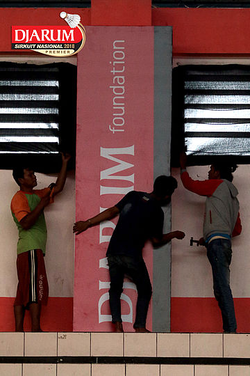 Tiga Orang Pekerja Sedang Mempersiapkan Perangkat Logistik Djarum Sirkuit Nasional Premier Li-Ning Jawa Tengah Open 2018