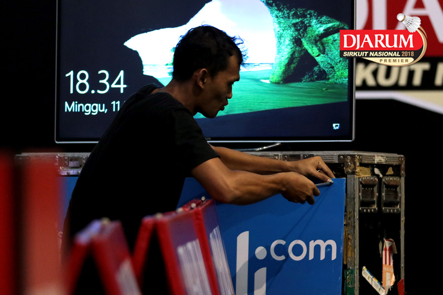 Seorang Pekerja Saat Mempersiapkan Perangkat Logistik Djarum Sirkuit Nasional Premier Li-Ning Jawa Tengah Open 2018 Di Booth Djarum Foundation