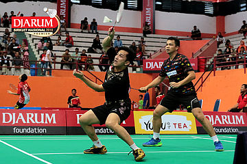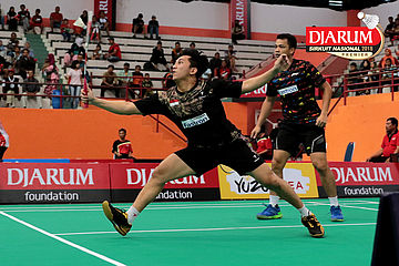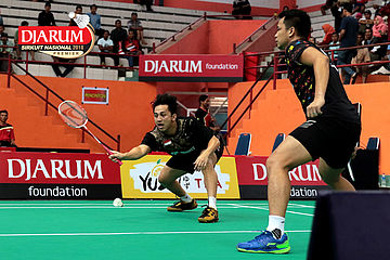 Hendra Aprida Gunawan/Rizko Asuro (Pertamina Fastron) Mengembalikan Shuttlecock