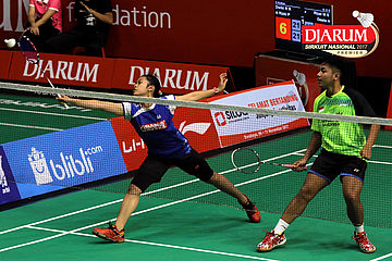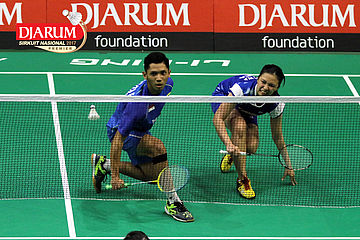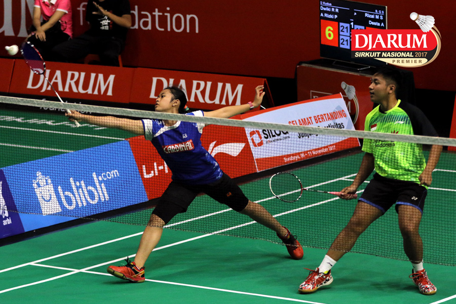 Fiesal Wiranto/Annisya Widya Permatasari (SGS PLN/Mutiara Cardinal) Mengembalikan Shuttlecock