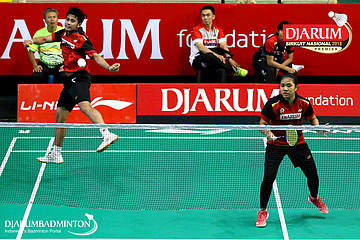 Amri Syahnawi/Pia Zebadiahbernadet (Jaya Raya Jakarta, Jakpus) mengembalikan shuttlecock