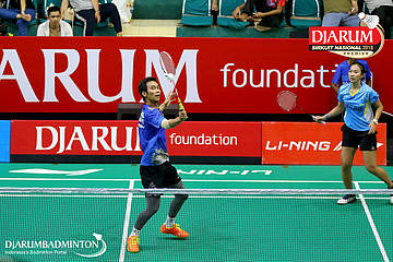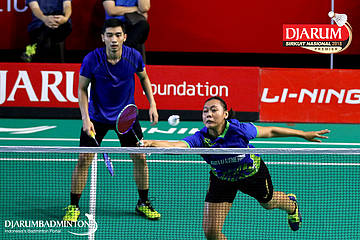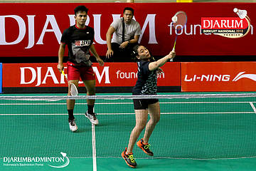 Yoggi Pamungkas/Fauzia Kartikasari (PB Djarum, Kudus) berusaha mengembalikan shuttlecock