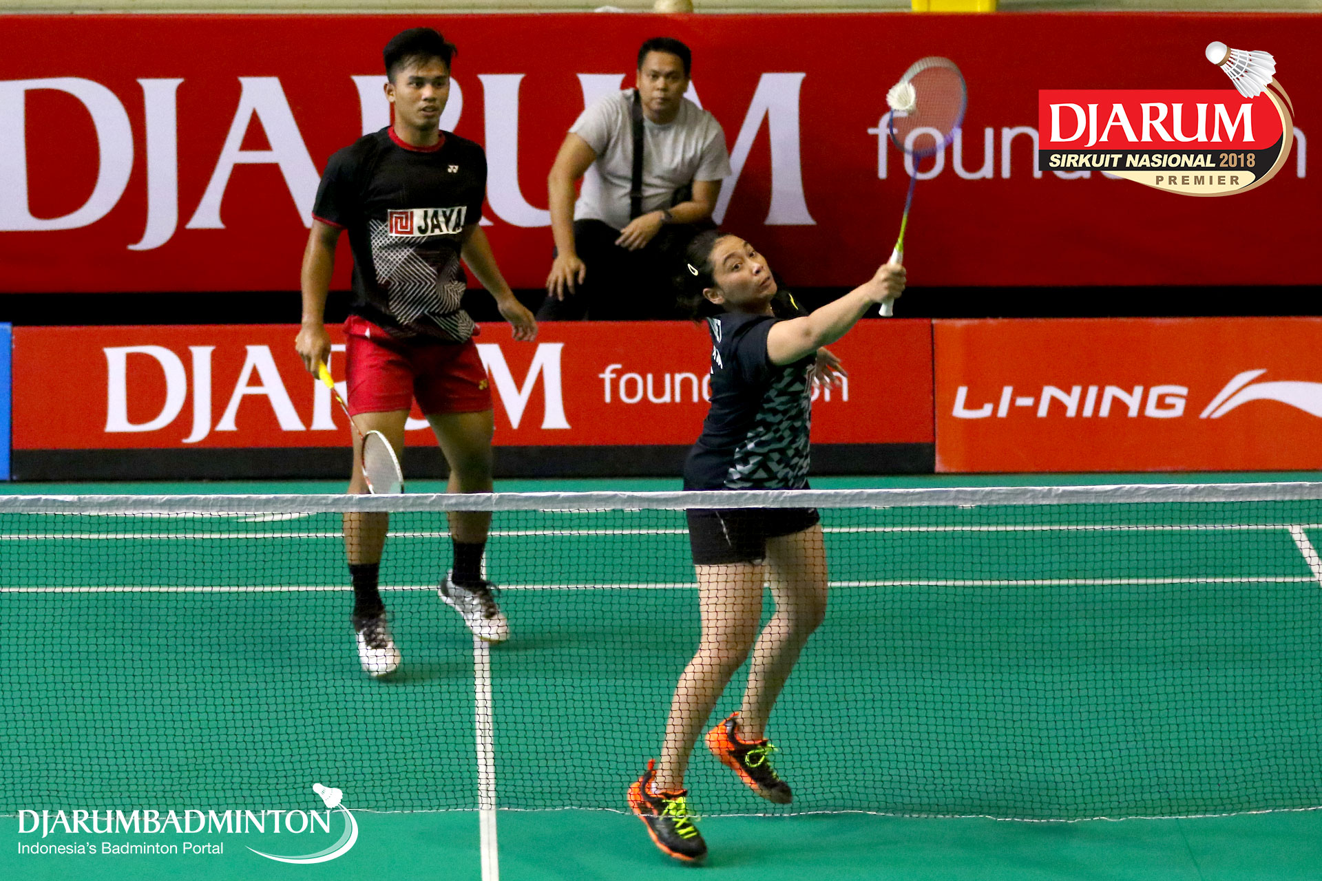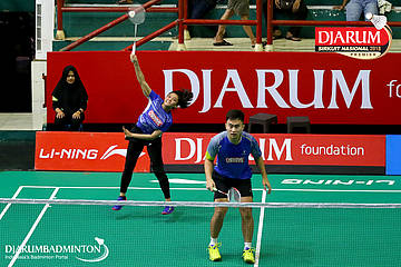 Amri Syahnawi/Pia Zebadiahbernadet (Jaya Raya Jakarta, Jakpus) menyambar shuttlecock
