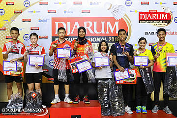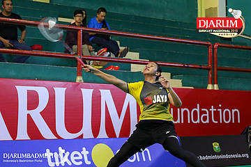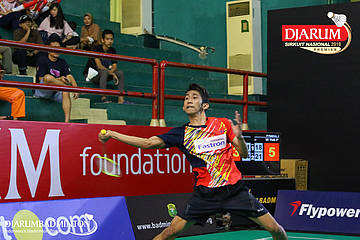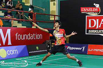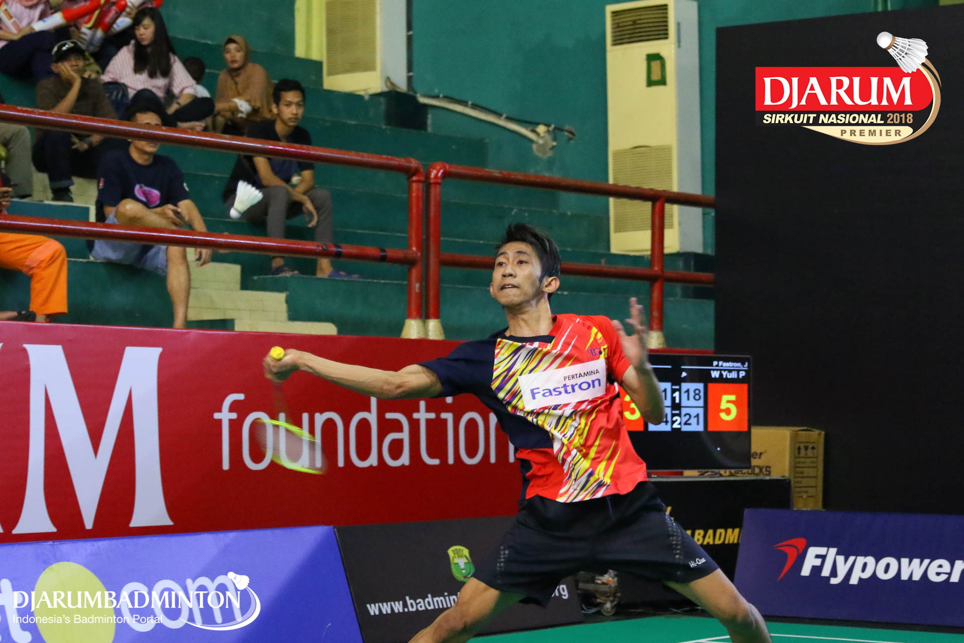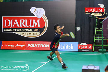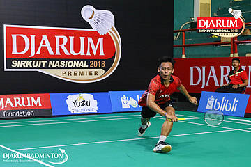 Wisnu Yuli Prasetyo (Pertamina Fastron, Jakut) menyambut shuttlecock