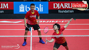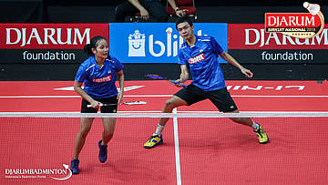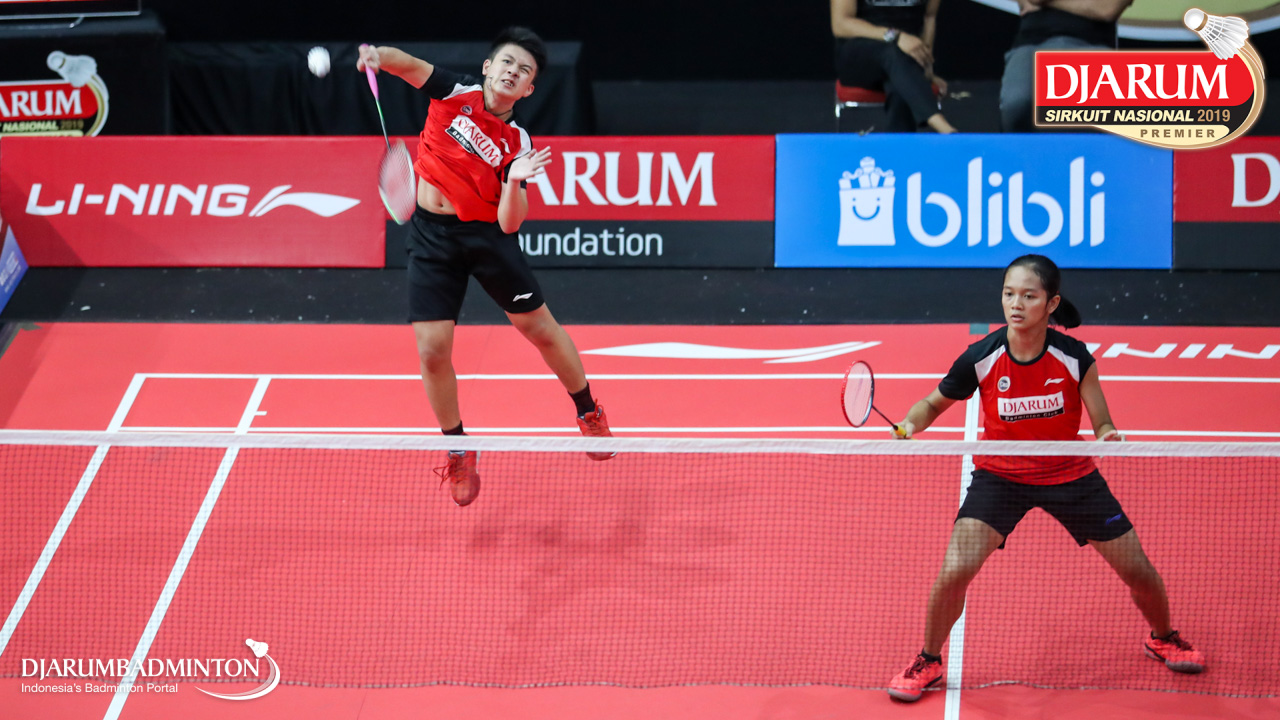 Mochamad Rafi Rizqi Kurniawan+Berliona Alma Pradisa (PB Djarum, Kudus) menyambut shuttlecock