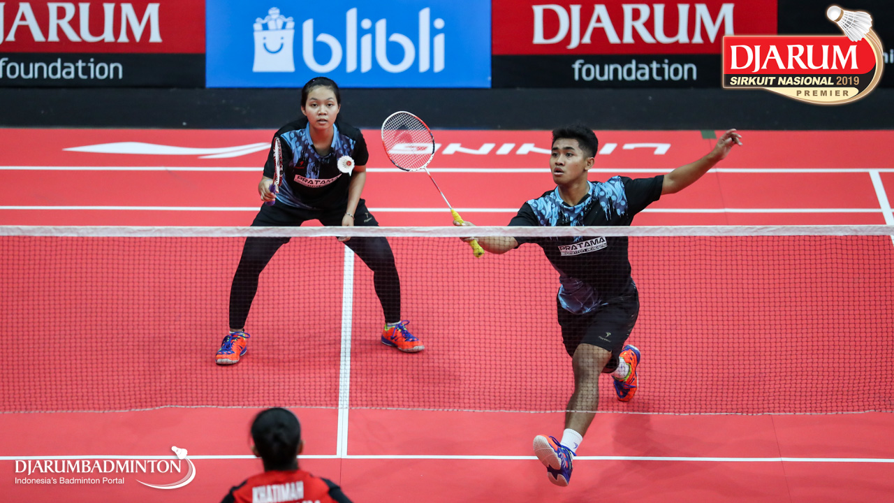 Muliadi Rizka Saputra+Trisma Arlisa Septiana (Pratama Badminton Academy, Sby) menyambut shuttlecock