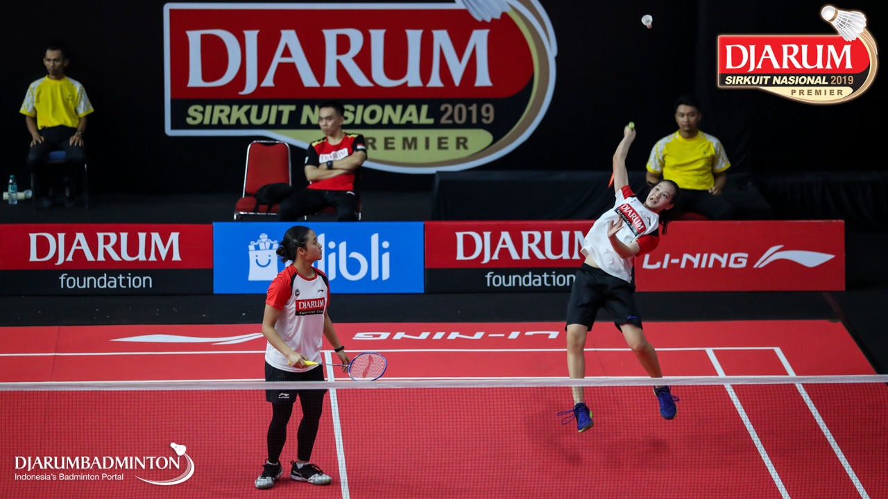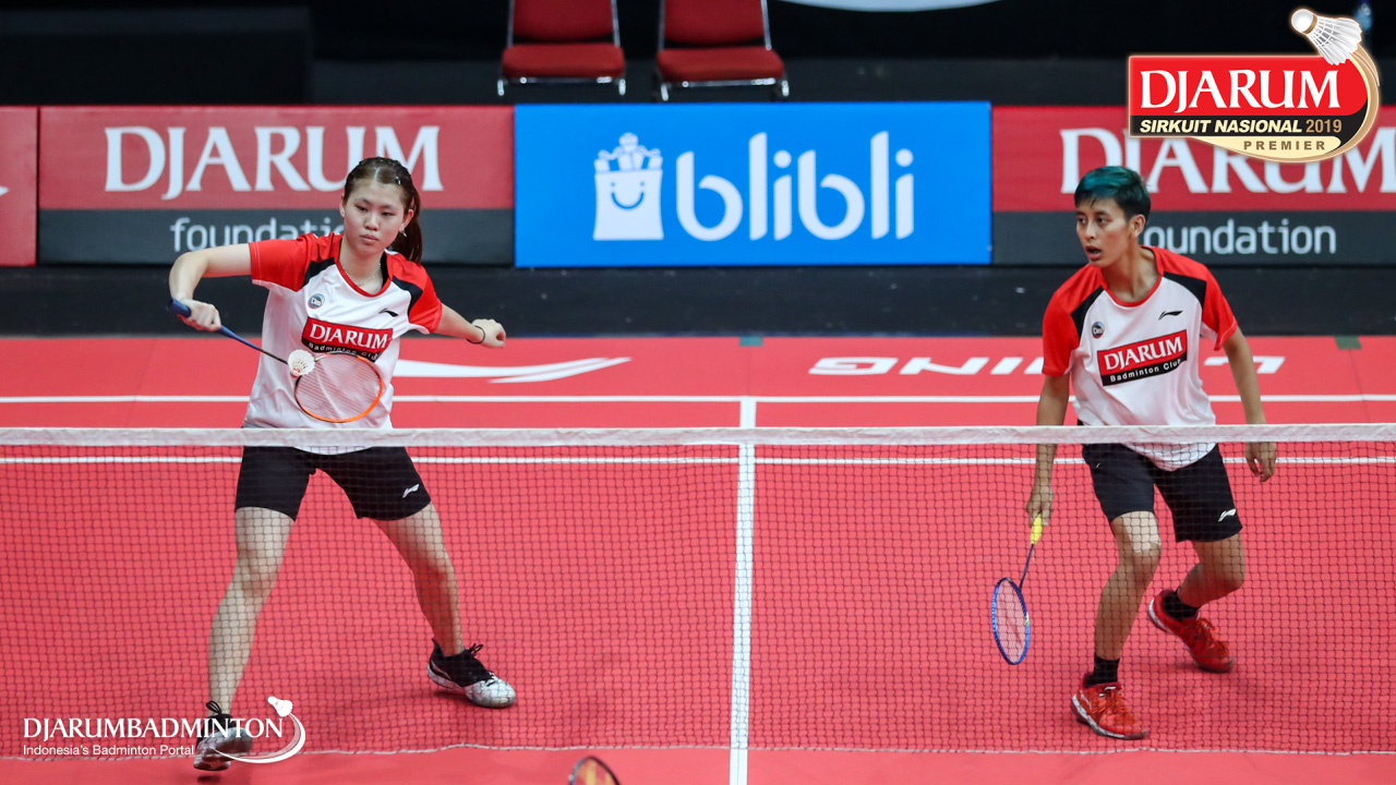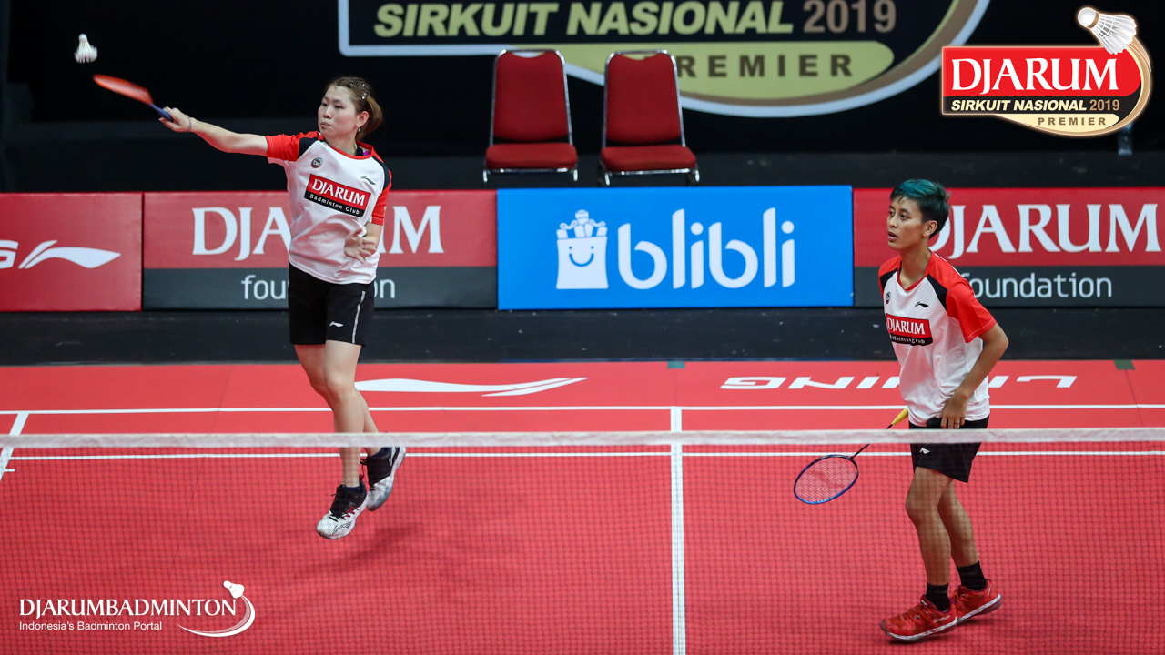 Khusnul Khatimah+Sang Ayu Putu Kharisma Maharani (PB Djarum, Kudus+PB Djarum, Kudus) menggapai shuttlecock