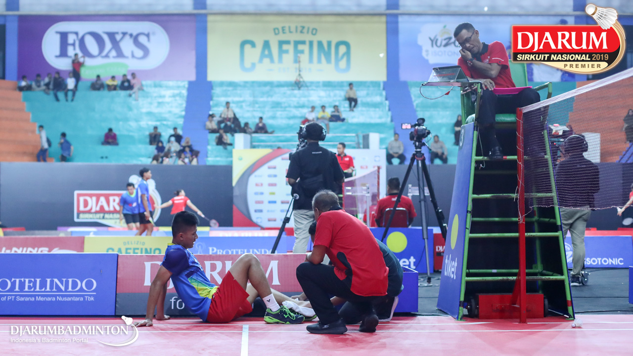 Tegar Sulistio (Exist Badminton Club) saat dalam penanganan tim medis