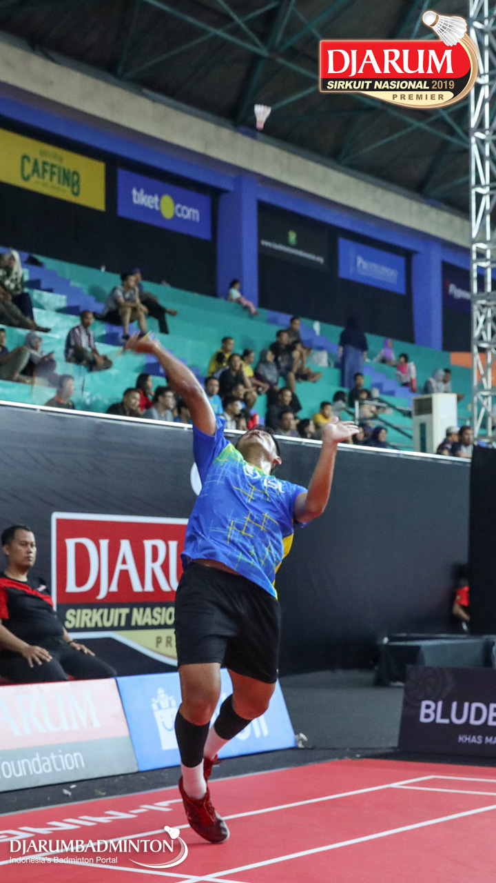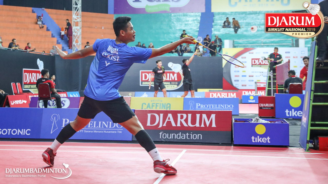 Muhammad Iqbal (Exist Badminton Club) bersiap melepaskan serangan