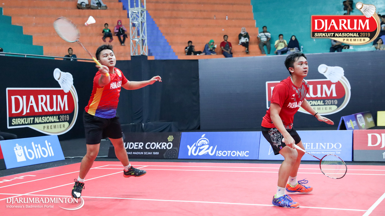 Abiyyu Fauzan Majid+Habib Alfariz (Sangkuriang Graha Sarana PLN Bandung) menyambut shuttlecock