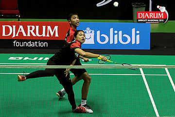 Amri Syahnawi/Shela Devi Aulia (Jaya Raya Jakarta) Mengembalikan Shuttlecock