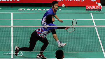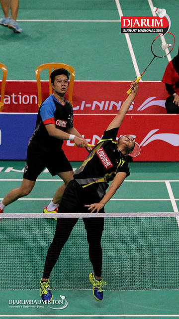I Kadek Pande Dheva Brahmantya Putra/Sintia Dewi Yuliani (PB Djarum Kudus) bersiap menghadang serangan