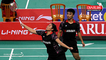 Reza Dwicahya Purnama/Annisya Widya Permatasari (Jaya Raya Jakarta/Mutiara Cardinal) bersiap menyambar pengembalian