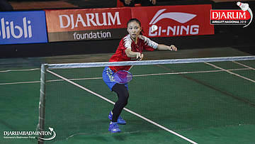 Michelle Pricilia Liwongan Lie (Sarwendah Badminton Club, Jaktim) bersiap menyambut shuttlecock