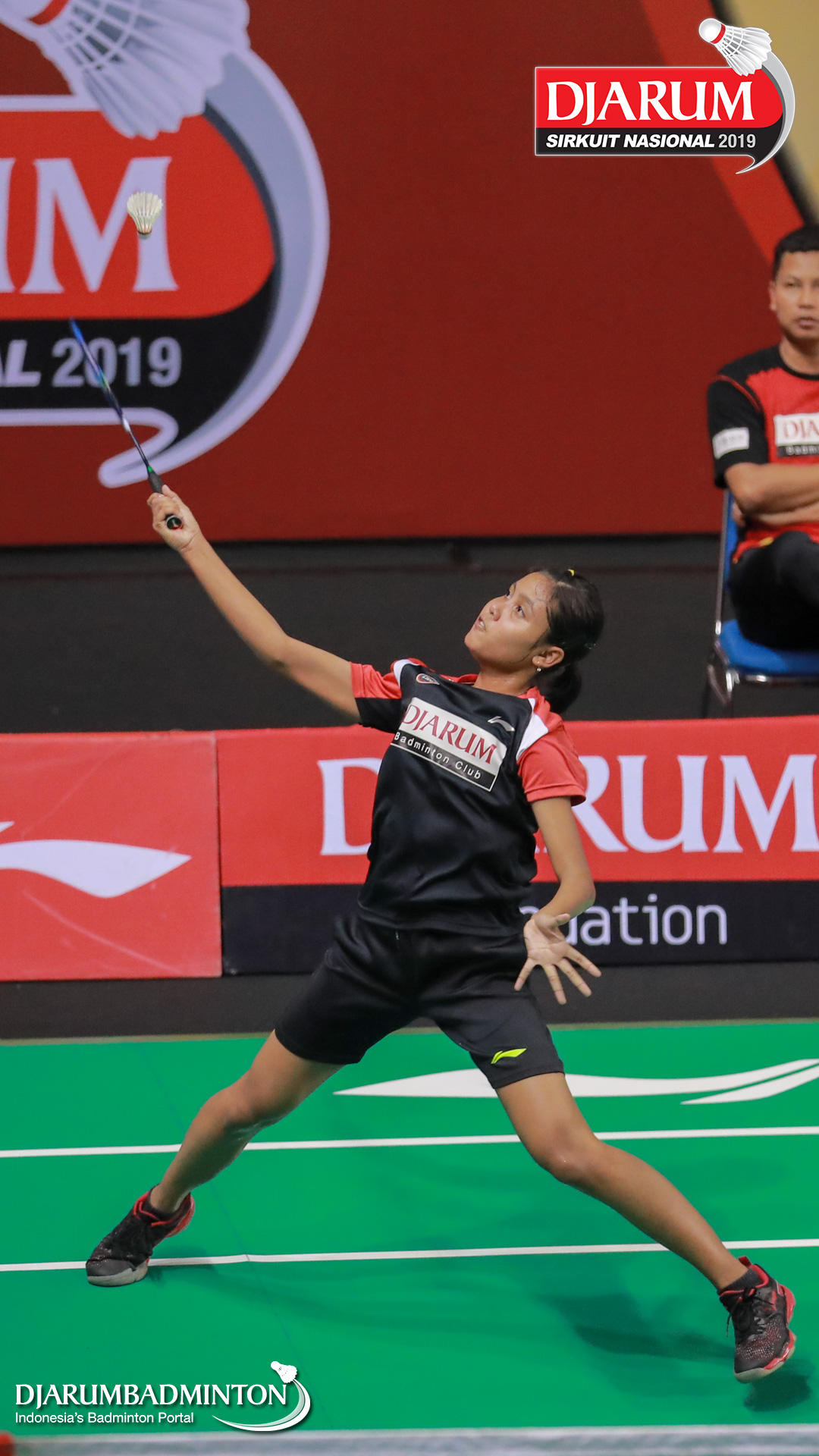 Adelista Cornelia Elysa P R (Jaya Raya Jakarta) berusaha menyambut shuttlecock