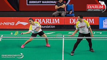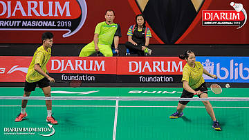 Mochamad Rafi Rizqi Kurniawan+Salli Lin (PB Djarum, Kudus) bersiap menyambut shuttlecock