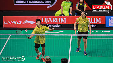 Adjie Sendang Nugroho+Sakira Salsabila (Pusat Pelatihan Olahraga Pelajar) bersiap melepaskan serangan