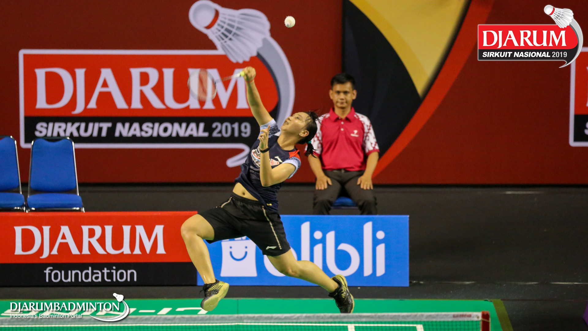 Ummy Ghoriibah (Emas Centre Jambi) mengembalikan shuttlecock