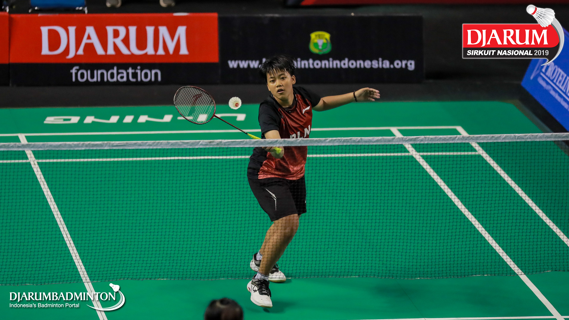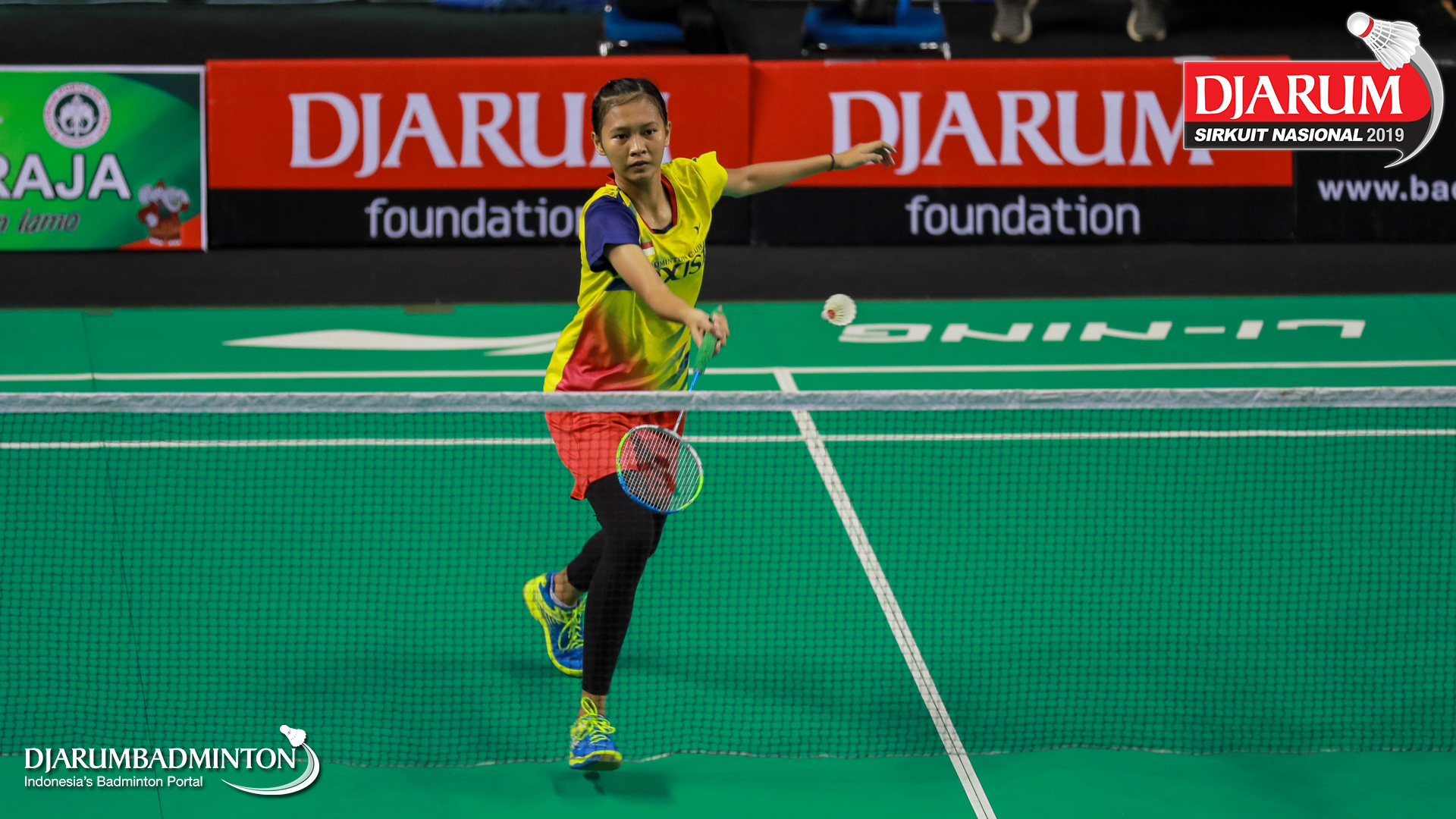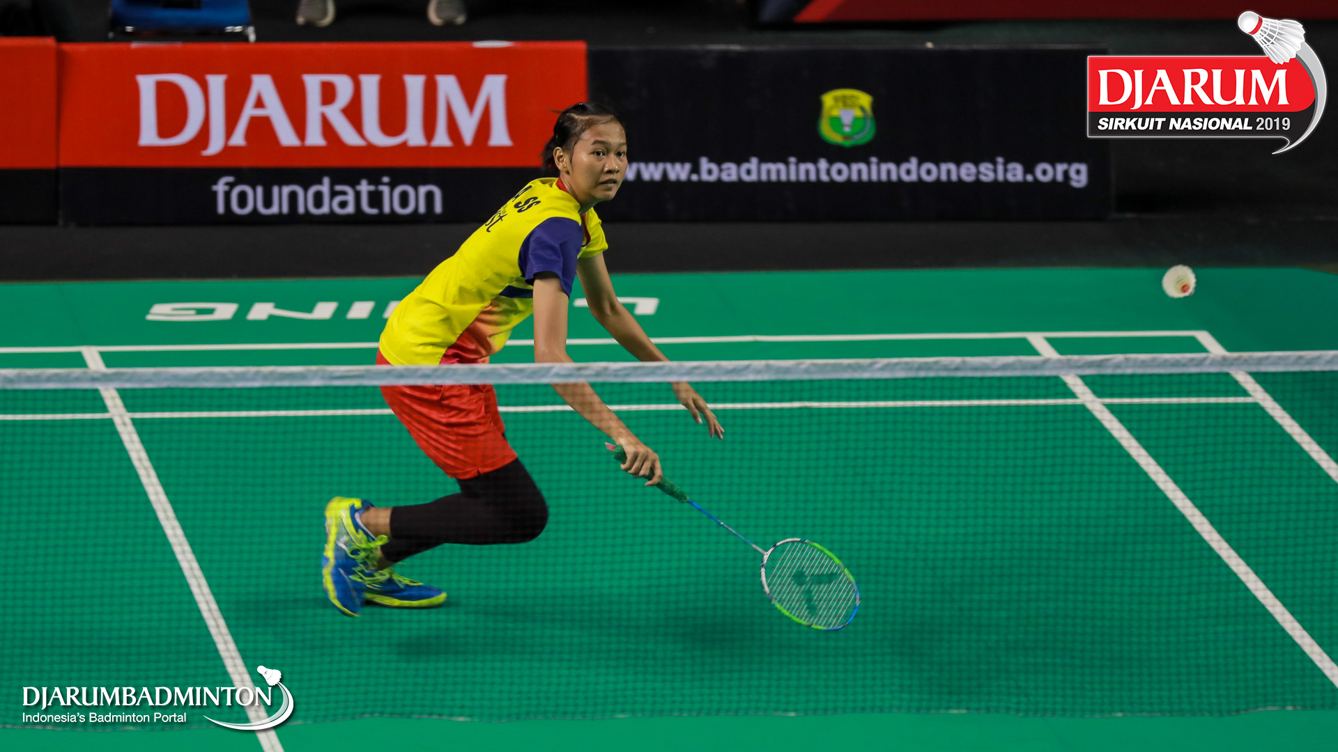 Siti Sarah Azzahra (Exist Badminton Club) bersiap menyambut shuttlecock