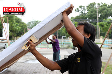 Salah satu pekerja sedang menyiapkan umbul-umbul Djarum Foundation.