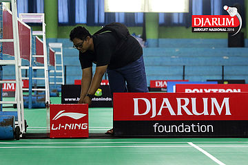 Salah satu pekerja menaruh tempat penyimpanan shuttlecock di pinggir lapangan.