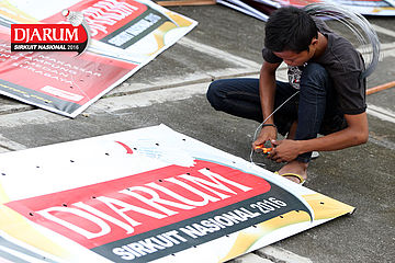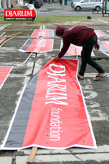 Salah satu pekerja sedang menyiapkan umbul-umbul Djarum Sirkuit Nasional 2016.