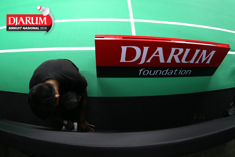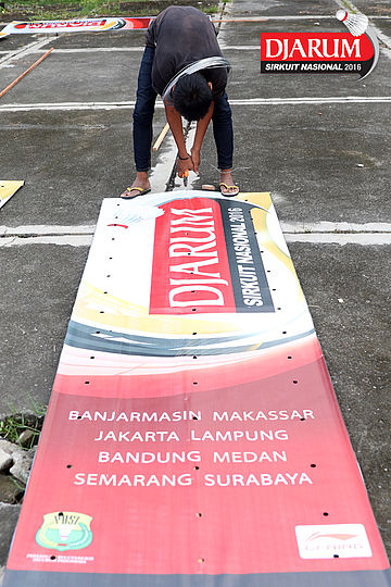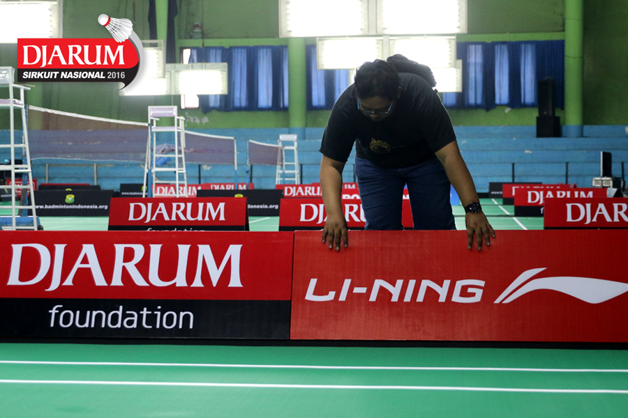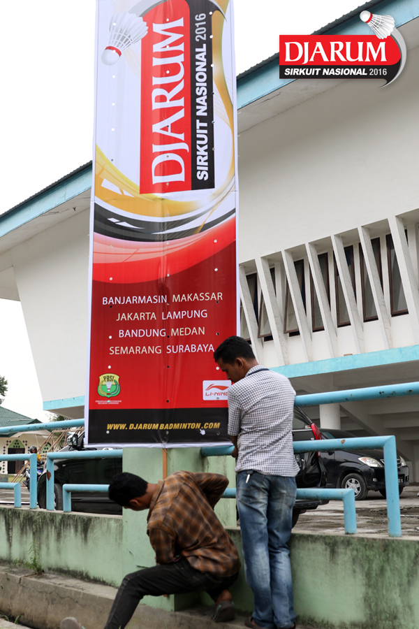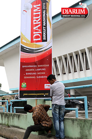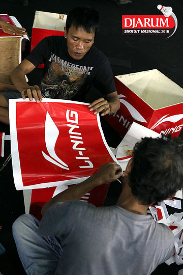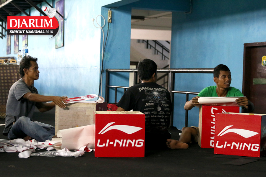 Dua pekerja sedang menyelesaikan dekorasi Djarum Sirkuit Nasional Li- Ning Sumatera Utara Open 2016.