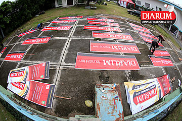 Beberapa pekerja sedang menyiapkan umbul-umbul Djarum Sirkuit Nasional 2016 dan Djarum Foundation.