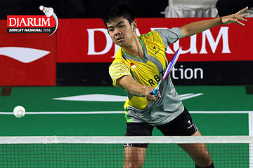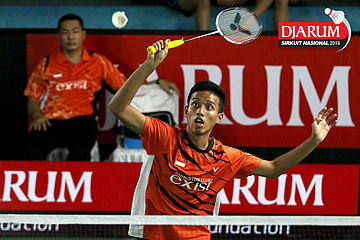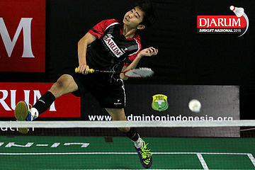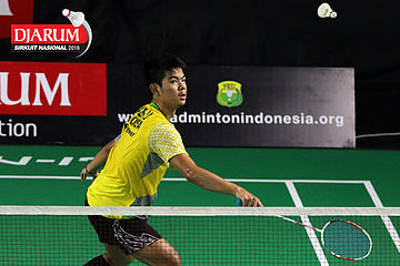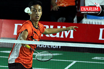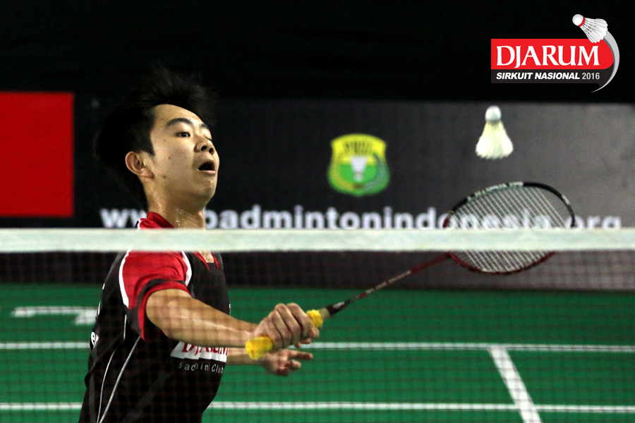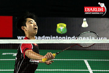 Alberto Alvin (Djarum Kudus) mengembalikan shuttlecock.