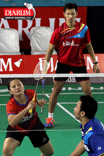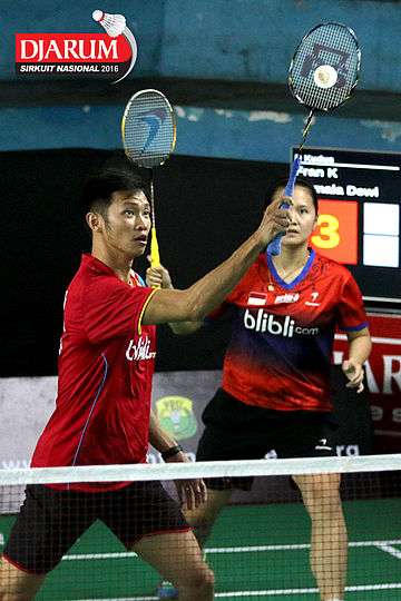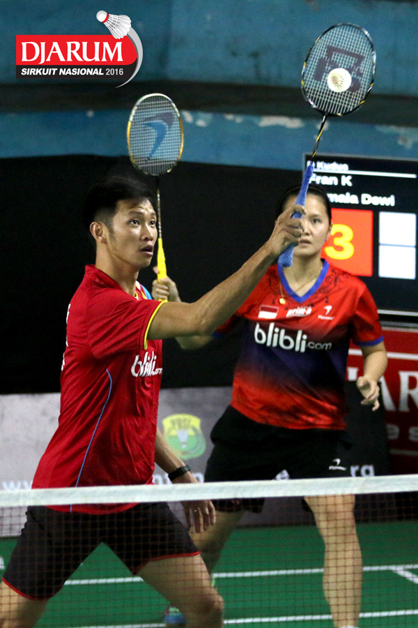 Fran Kurniawan/Komala Dewi (Djarum Kudus) menghadang serangan.
