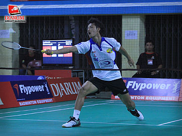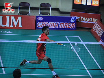 Nugroho Andi Saputra (PB.Djarum) menjemput shuttlecock