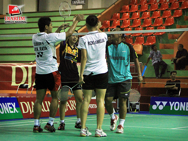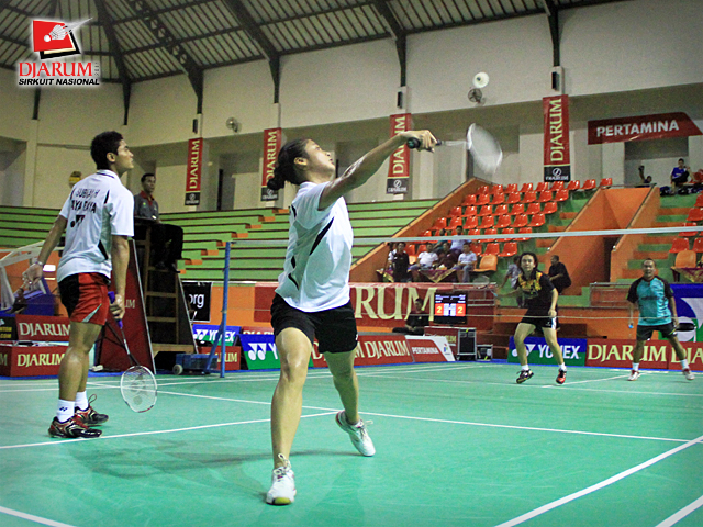 Pasangan ganda campuran Pusdiklat Jaya Raya, Subhan Hasan/Rizky Amelia Pradipta berusaha mengembalikan kok ke arah pasangan Trikus Harjanto/Kesya Nurvita dalam perempat final ganda dewasa campuran Djarum Sirkuit Nasional Bali di GOR Purna Krida, Badun