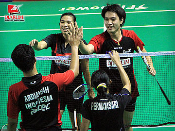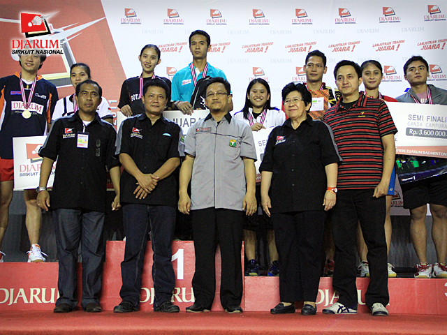 Para juara ganda campuran berpose bersama dalam penyerahan hadiah Djarum Sirkuit Nasional Makassar.