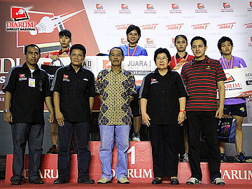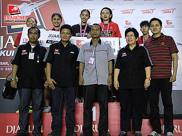 Para juara tunggal putri berpose bersama dalam penyerahan hadiah Djarum Sirkuit Nasional Makassar.