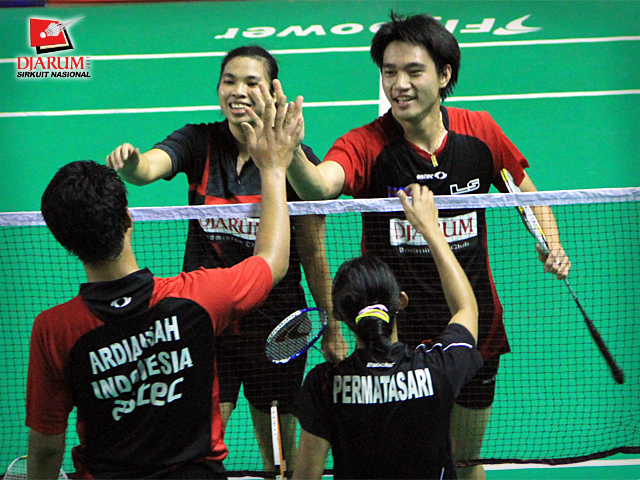 Para juara ganda putra berpose bersama dalam penyerahan hadiah Djarum Sirkuit Nasional Makassar.