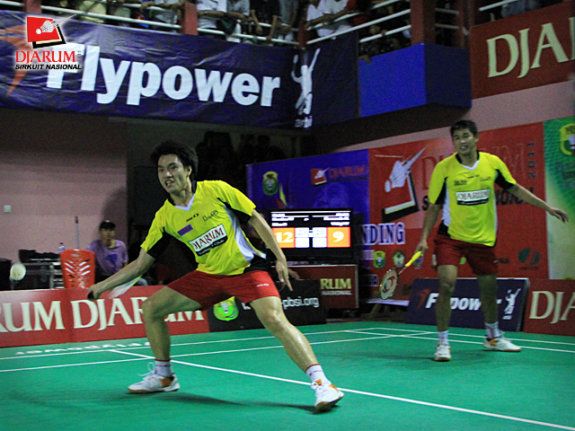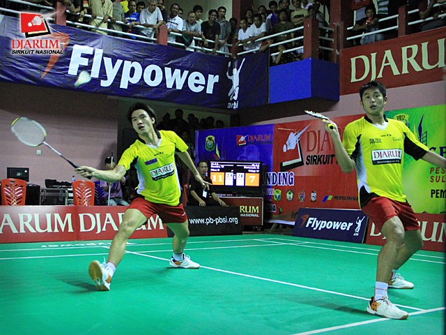Pemain PB Djarum, Rendra Wijaya/Rian Sukmawan berusaha mengembalikan kok ke arah pemain PB Djarum, Fernando K./Wifqi Windarto dalam babak final ganda dewasa putra Djarum Sirkuit Nasional Makassar di GOR Sungguminasa, Gowa, Sabtu (22/10).