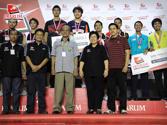 Para juara tunggal putra berpose bersama dalam penyerahan hadiah Djarum Sirkuit Nasional Makassar.