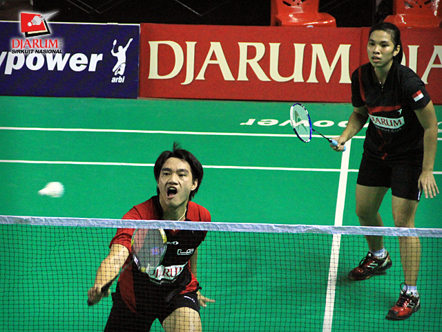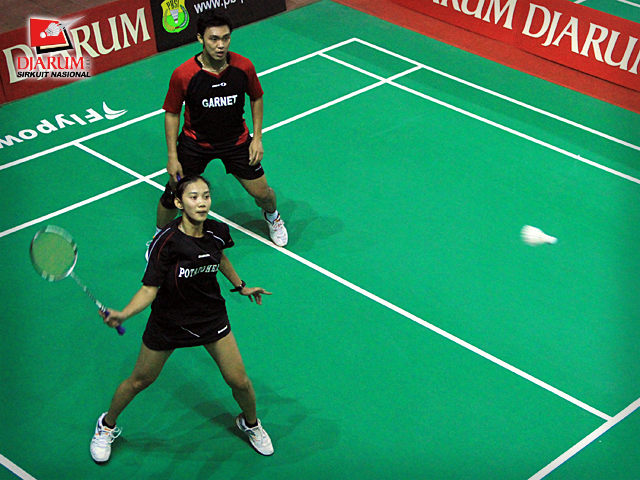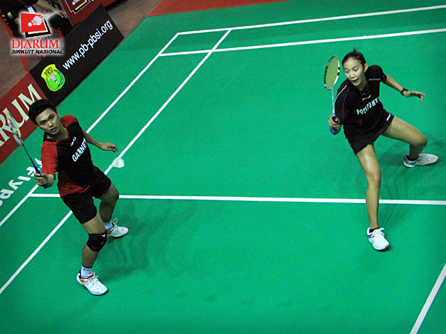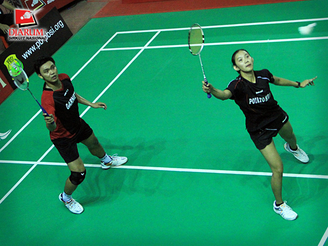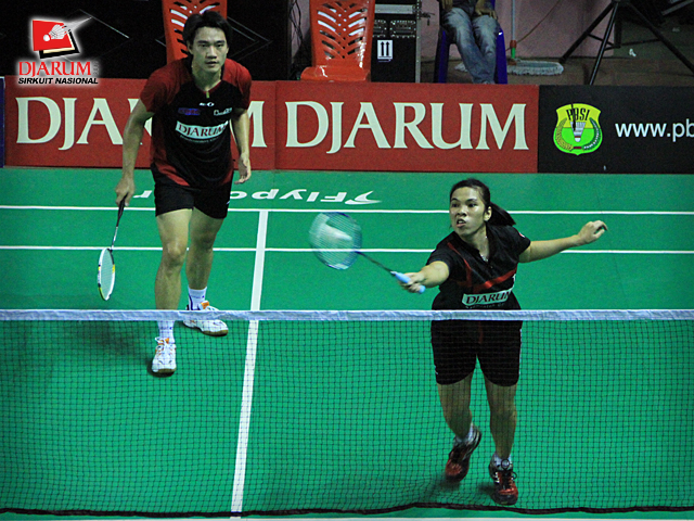 Pemain PB Ganesha Islamic Village/SGS Elektrik PLN, Ardiansyah/Devi Tika P. berusaha mengembalikan kok ke arah pemain PB Djarum, Rendra Wijaya/Maria Elfira C. dalam babak final ganda dewasa campuran Djarum Sirkuit Nasional Makassar di GOR Sungguminasa