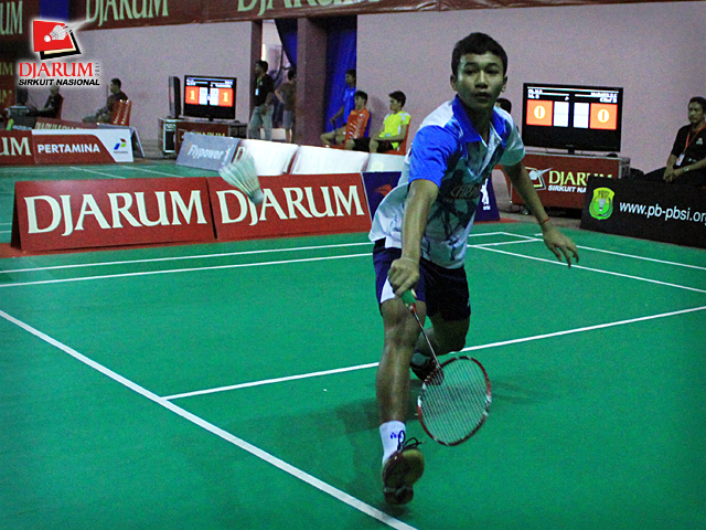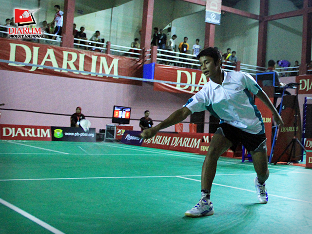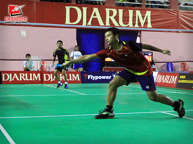 Pemain Pusdiklat Jaya Raya, Imam Adi Kusuma berusaha mengembalikan kok ke arah pemain PB. Fila Watch Makassar, Chairil Anwar dalam babak penyisihan tunggal remaja putra Djarum Sirkuit Nasional Makassar di GOR Sungguminasa, Gowa, Senin (17/10).
