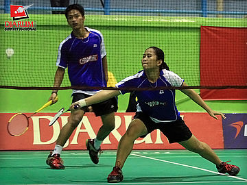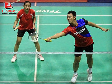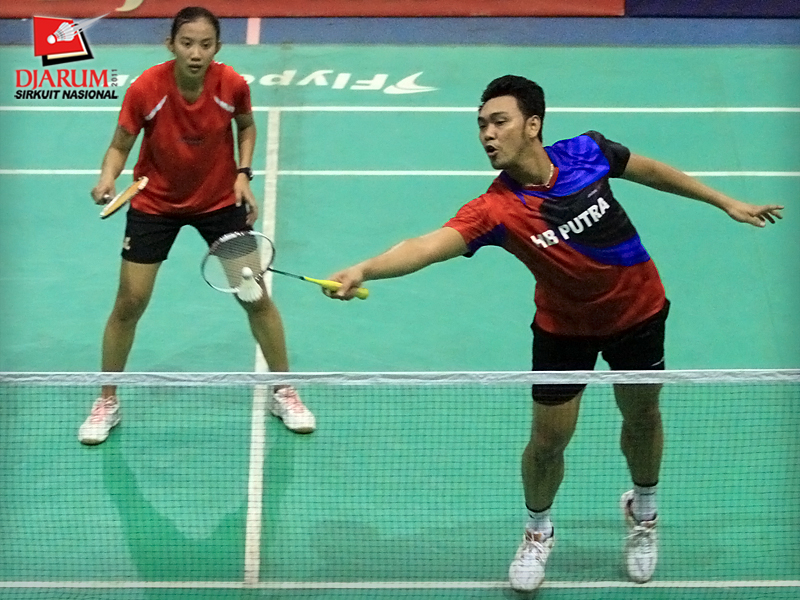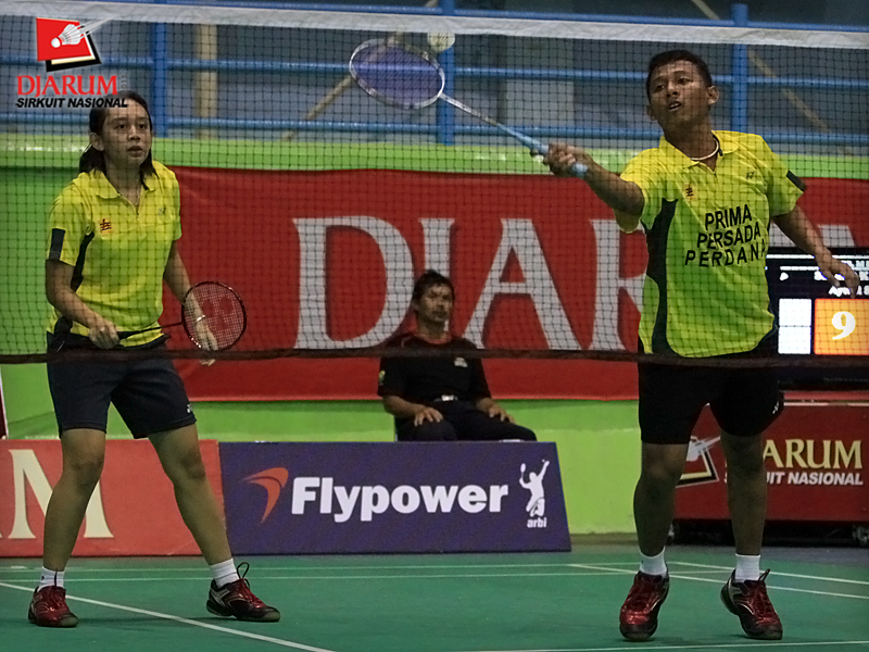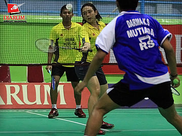 Pasangan asal SGS PLN Bandung,Andhika Anhar/Keshya Nurvita Hanadia mengembalikan pukulan ke arah pasangan PB Mutiara Bandung, Sandi Darma Kusumah/Ayu Rahma dalam laga perempatfinal Djarum Sirkuit Nasional Pangkalpinang di GOR Kacang Pedang,Kamis (22/09)