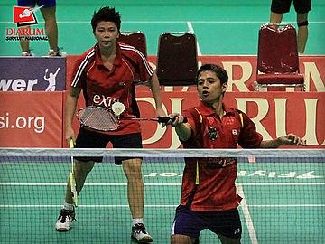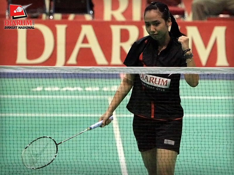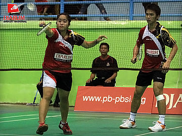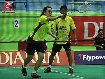 Ekspresi pasangan asal SGS PLN Bandung, Andhika Anhar/Keshya Nurvita Hanadia ketika berhadapan kontra pasangan PB Mutiara Bandung Sandi Darma Kusumah/Ayu Rahma Sari dalam laga perempatfinal Djarum Sirkuit Nasional Pangkalpinang, Kamis (22/09)