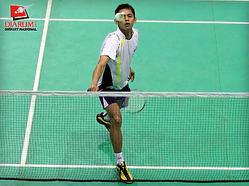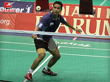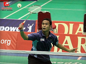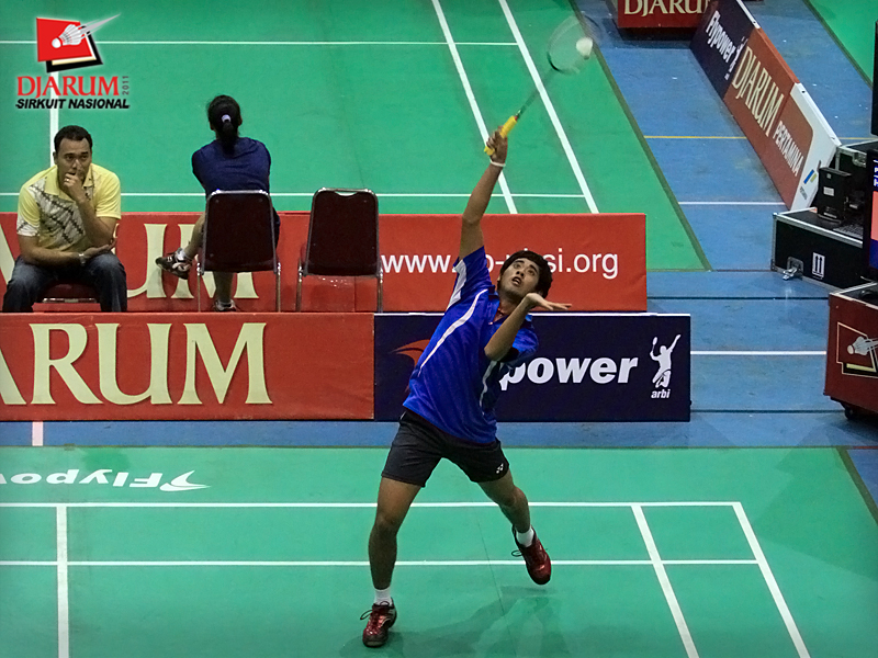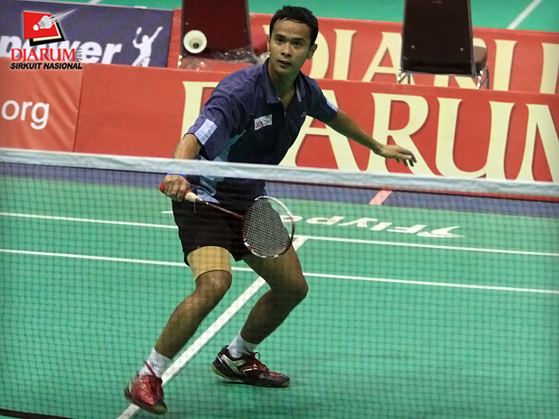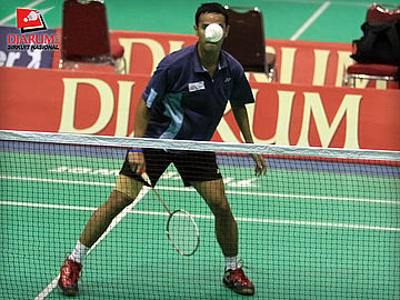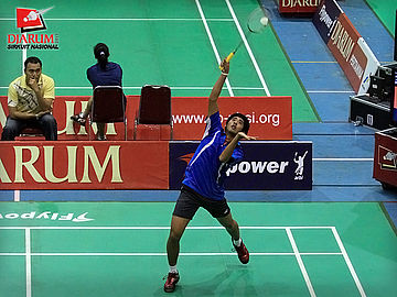 Pemain SGS PLN Bandung, Senatria Agus berusaha mengembalikan kok ke arah pemain PB Djarum, Bandar Sigit di babak semifinal Sirkuit Nasional Pangkalpinang di GOR Kacang Pedang, Pangkalpinang, Jumat (23/9).