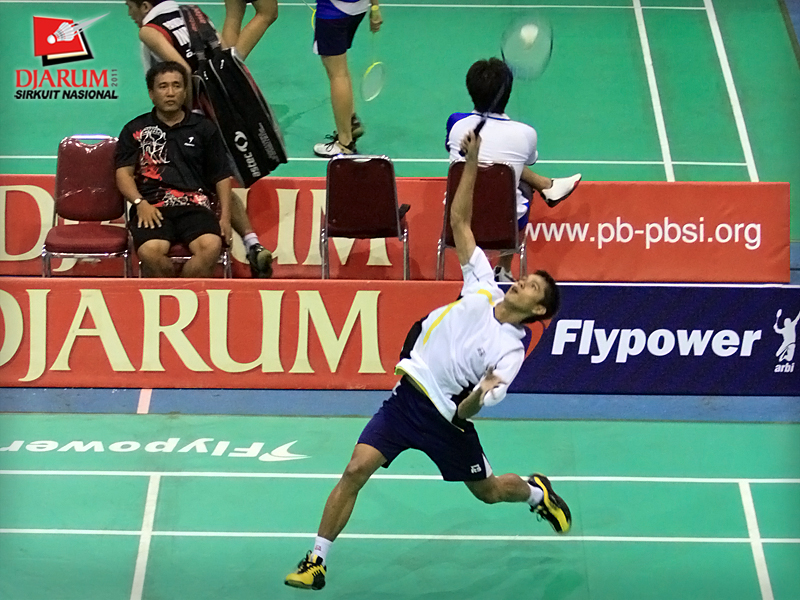 Pemain PB Djarum, Bandar Sigit berusaha mengembalikan kok ke arah pemain SGS PLN Bandung, Senatria Agus di babak semifinal Sirkuit Nasional Pangkalpinang di GOR Kacang Pedang, Pangkalpinang, Jumat (23/9).