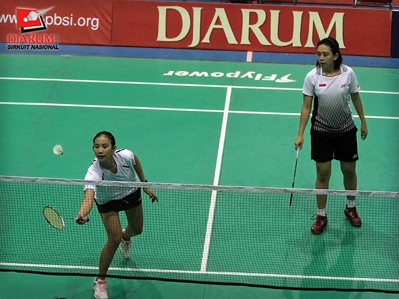Pasangan ganda putri Devi Tika/Keshya Nurvita Hanadia berusaha mengembalikan kok ke arah pasangan Astuti/Yosephin di babak semifinal Sirkuit Nasional Pangkalpinang di GOR Kacang Pedang, Pangkalpinang, Jumat (23/9).