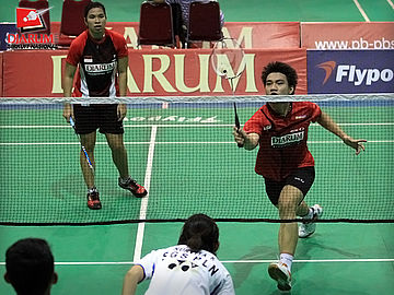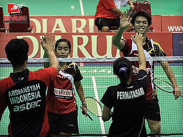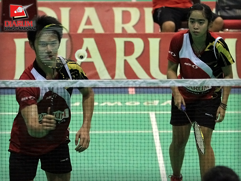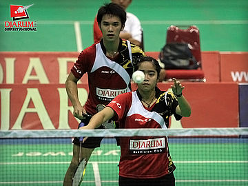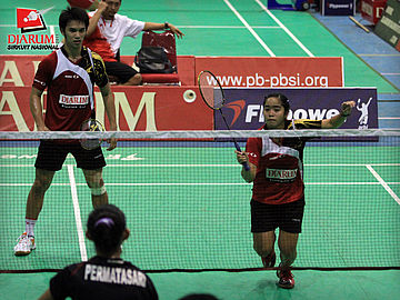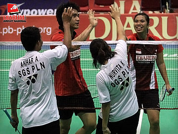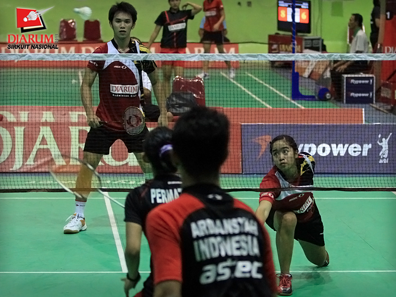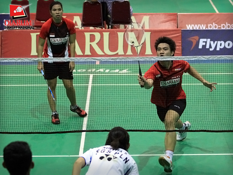 Pasangan ganda campuran asal PB Djarum, Fernando Kurniawan/Annisa Wahyuni berusaha mengembalikan kok ke arah pasangan Ardiansyah Putra/Devi Tika Sari di babak semifinal Sirkuit Nasional Pangkalpinang di GOR Kacang Pedang, Pangkalpinang, Jumat (23/9).