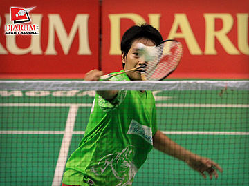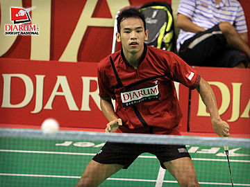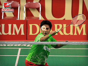 Pemain Bank Sumsel-Babel, Achmad Rivai berusaha mengembalikan kok ke arah pemain PB Djarum, Gary dalam babak penyisihan tunggal dewasa putra Djarum Sirkuit Nasional Surabaya di GOR Sudirman, Surabaya, Selasa (1/11).