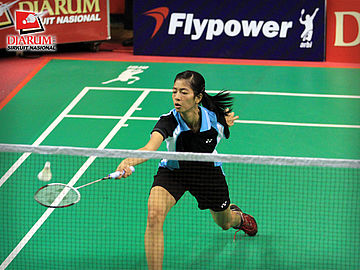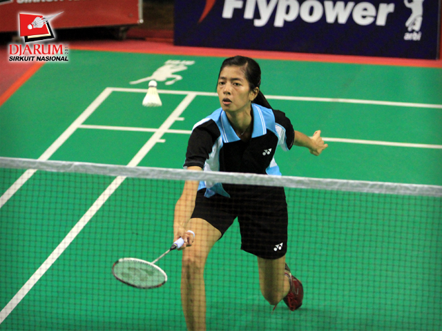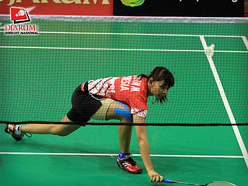 Pemain PB Djarum Kudus, Maria Kristin hampir terjatuh saat berusaha mengembalikan kok ke arah pemain Pelatnas, Ayu Wanda Tika dalam babak penyisihan tunggal dewasa putri Djarum Sirkuit Nasional Surabaya di GOR Sudirman, Surabaya, Selasa (1/11).