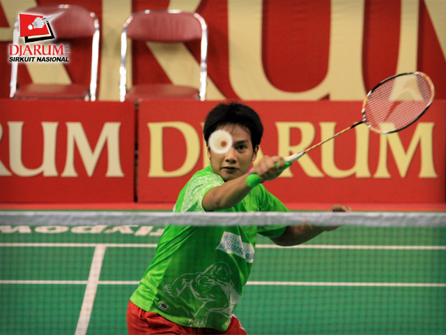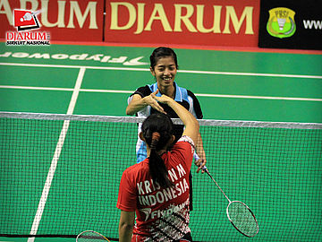 Sportivitas permainan ditunjukkan saat Pemain PB Djarum Kudus, Maria Kristin menang atas lawannya pemain Pelatnas, Ayu Wanda Tika dalam babak penyisihan dewasa putri Djarum Sirkuit Nasional Surabaya di GOR Sudirman, Surabaya, Selasa(1/11).