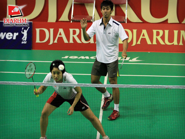 Pemain PB Djarum, Kenas Adi Haryanto/Tresna Novelia berusaha mengembalikan kok ke arah pemain Putra Mahesa, Ariska Yoga Pratama/ Maria O dalam babak perdelapan final ganda campuran taruna.